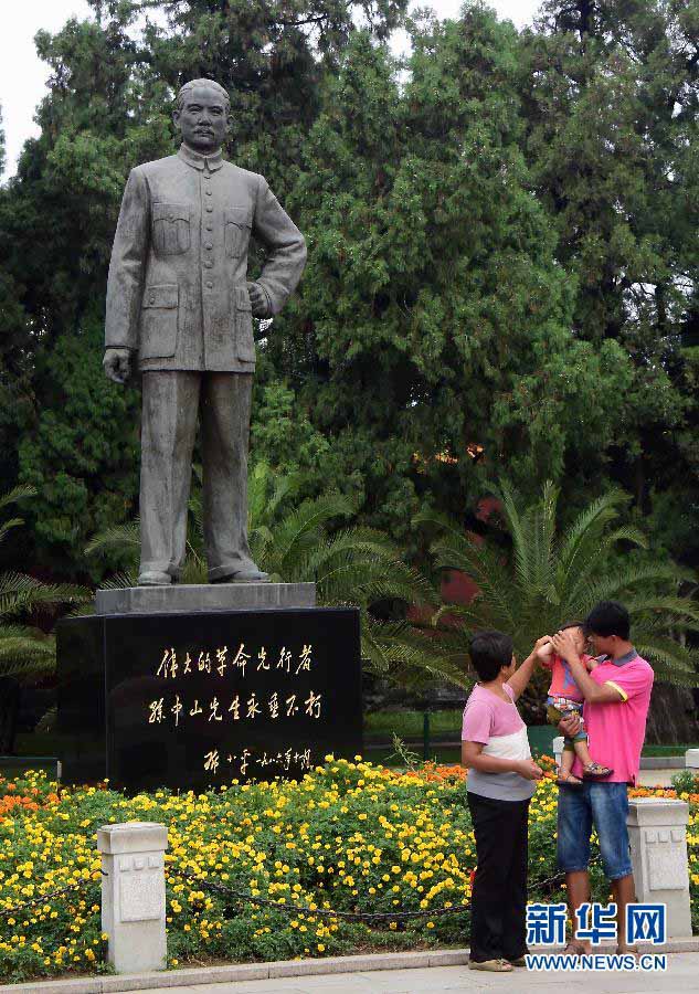 Des visiteurs se préparent pour une photo souvenir devant la statue du Dr. Sun Yat-sen dans le Parc Sun Yat-sen de Beijing (photo du 31 ao?t 2014).