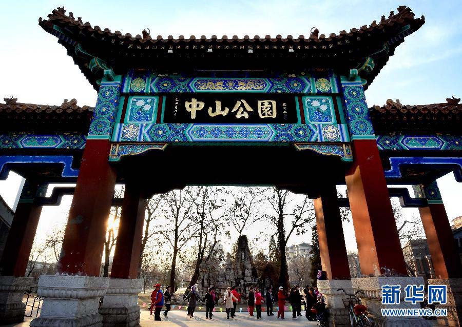 Un groupe de femmes fait de l'exercice derrière l'arche de l'entrée principale du Parc Sun Yat-sen de Tianjin (photo du 4 mars 2015).