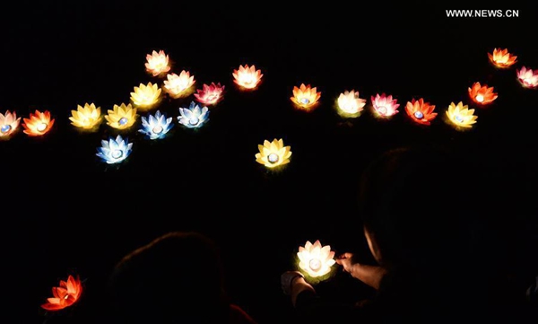 Des résidents font flotter des lanternes dans une rivière du district de Wanli à Nanchang, la capitale de la province du Jiangxi, le 1e avril 2015. [Photo/Xinhua]