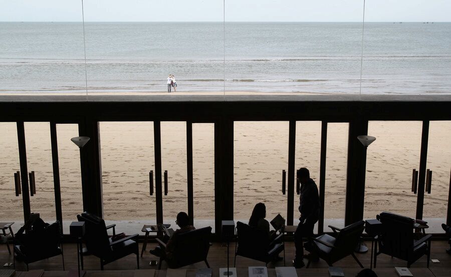 Les lecteurs d'une bibliothèque isolée qui se trouve à des centaines de mètres de Beidaihe, une station balnéaire populaire habituellement bondée de touristes, dans la Province du Hebei en Chine du Nord, le 12 mai 2015. La bibliothèque de deux étages, construite pour un usage public, est également un endroit agréable pour regarder les vagues et les marées. [Photo / CFP]