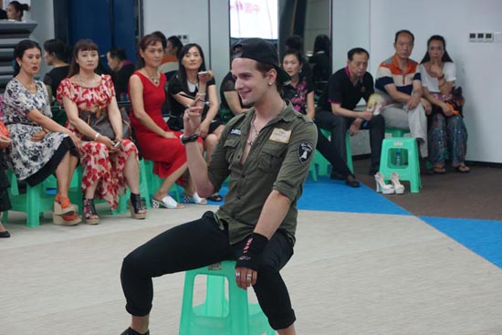 | Un professionnel de la compagnie Seacoo montre aux mannequins les bonnes techniques pour le défilé, le 20 mai 2015 |