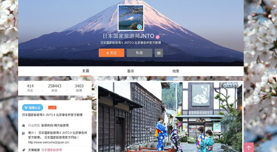 | Capture d'écran de la page d'accueil de l'Office National du Tourisme Japonais sur Weibo.com. [Photo/weibo.com] |