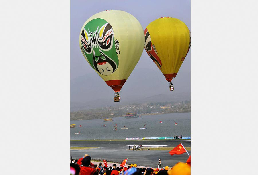 Photo d'archives prise le 24 octobre 2009 montrant des montgolfières décorées de motifs de masques de l'Opéra de Pékin lors de la cérémonie d'ouverture de la Chine internationale Airsports Fiesta à Laiwu, dans la province du Shandong, dans l'est de la Chine). [Photo / Xinhua]