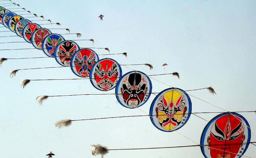 Photo d'archives prise le 26 mars 2006 montrant un énorme cerf-volant décoré de motifs de masques de l'opéra de Pékin à Zhengzhou, capitale de la province centrale du Henan. [Photo / Xinhua]