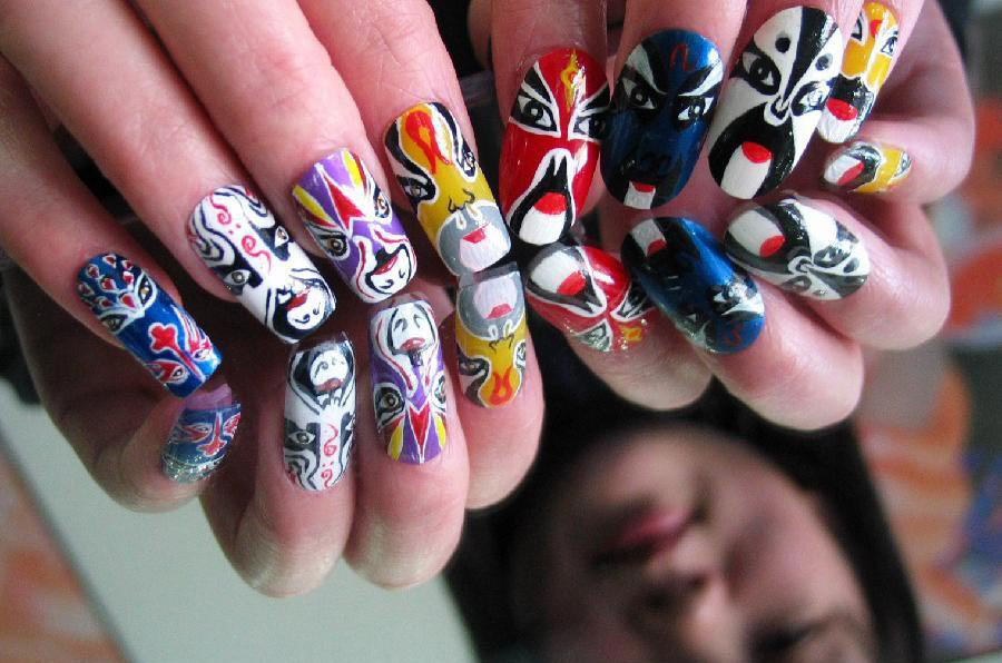 Photo d'archives prise à Jinan, capitale de la province du Shandong dans l'est de la Chine montrant des ongles peints avec les motifs de masques de l'opéra de Pékin. [Photo / Xinhua]