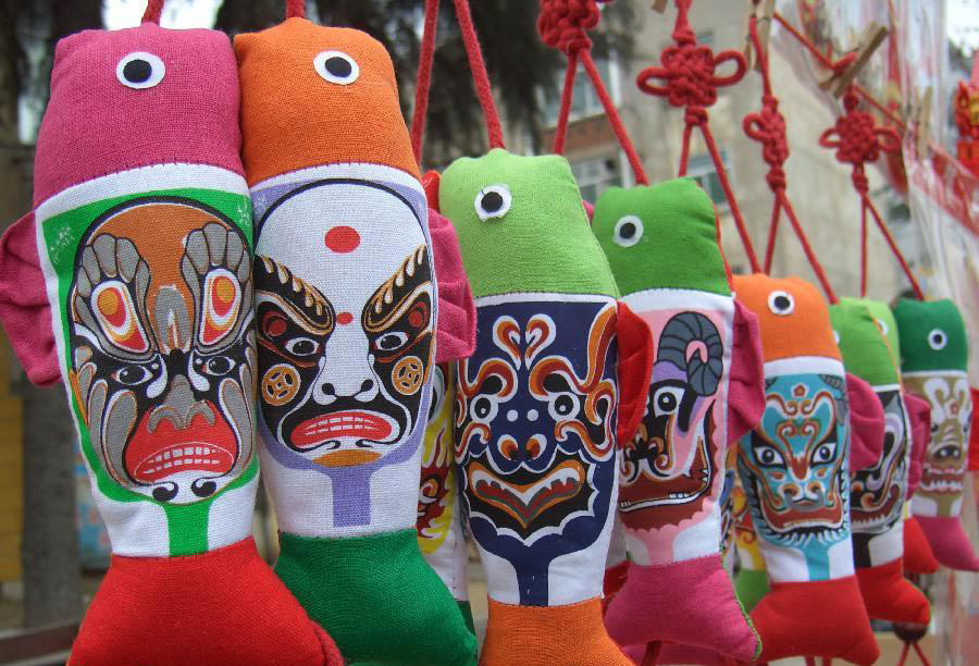 Photo d'archives prise le 16 février 2007 montrant des oreillers en forme de poisson décorés de motifs de masques de l'opéra de Pékin à Zaozhuang, dans la province du Shandong, dans l'est de la Chine. [Photo / Xinhua]