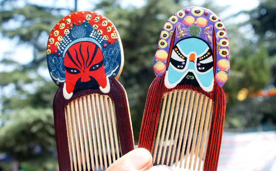 Photo d'archives prise le 27 ao?t 2005, montrant des peignes décorés de motifs de masques de l'opéra de Pékin lors d'une expo d'art populaire à Jinan, capitale de la province du Shandong dans l'est de la Chine. Les masques de l'opéra de Pékin sont progressivement devenus un élément à la mode dans la vie quotidienne des Chinois. [Photo / Xinhua]
