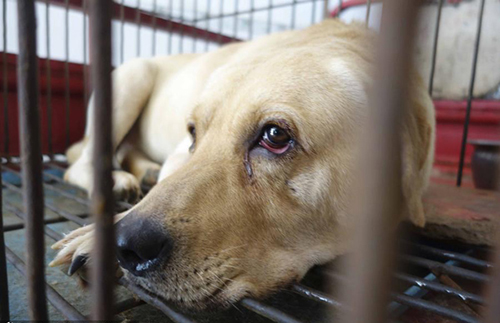 | Un chien destiné à être abattu dans une cage d’un marché aux chiens à Yulin, dans la Région autonome Zhuang du Guangxi, dans le Sud-Ouest de la Chine, le 19 juin 2015. [Photo / CFP] |