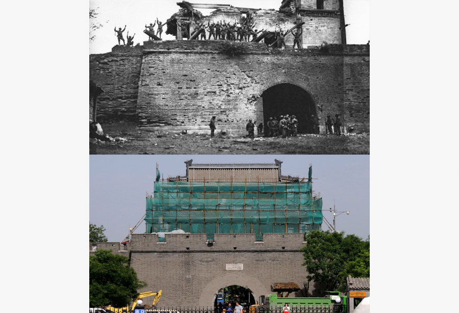 Cette série de photos montre la porte de la tour du comté de Wanping à différentes périodes. Une image en noir et blanc montre des soldats japonais célébrés la zone occupée du comté de Wanping, le 26 juillet 1937. Alors qu'un autre cliché montre la tour de la porte en cours de rénovation, le 19 mai 2015. [Photo/IC]