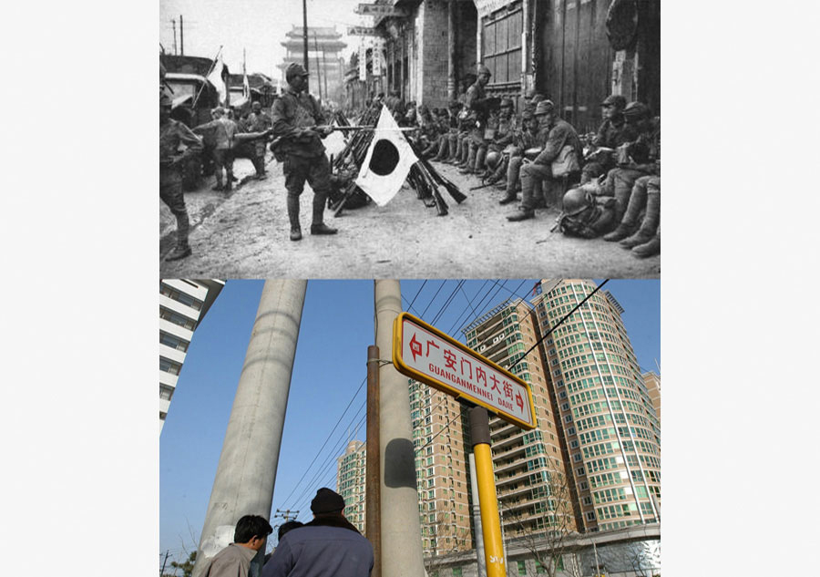 Les soldats japonais prennent un repas dans la rue, près de Guanganmen à Beijing, image prise le 8 ao?t 1937. La rue de Guanganmen et ses batiments modernes. [Photo/IC]