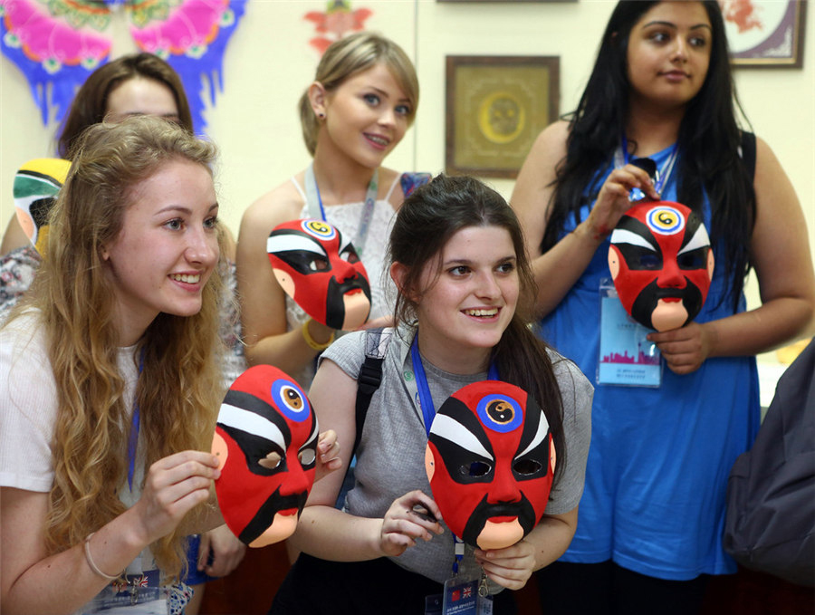 De jeunes étudiantes présentent des masques de l'Opéra de Pékin, qu'elles ont elles-mêmes décoré à Tianjin, le 16 juillet 2015. [Photo/IC]