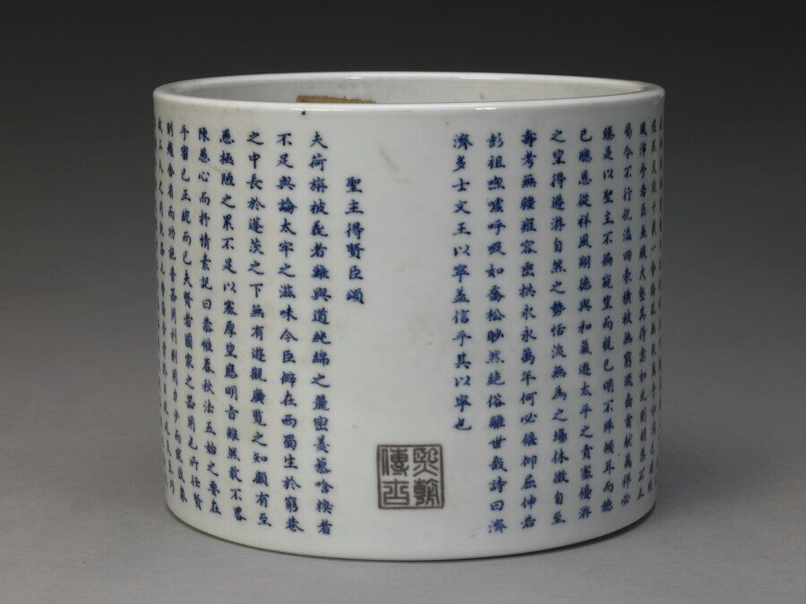 Un pot à pinceaux avec des inscriptions bleues et un sceau rouge-cuivre sous gla?ure, qui témoigne d'une nouvelle tendance dans le design de la porcelaine dans l'histoire chinoise. [Photo / Musée de la Capitale]