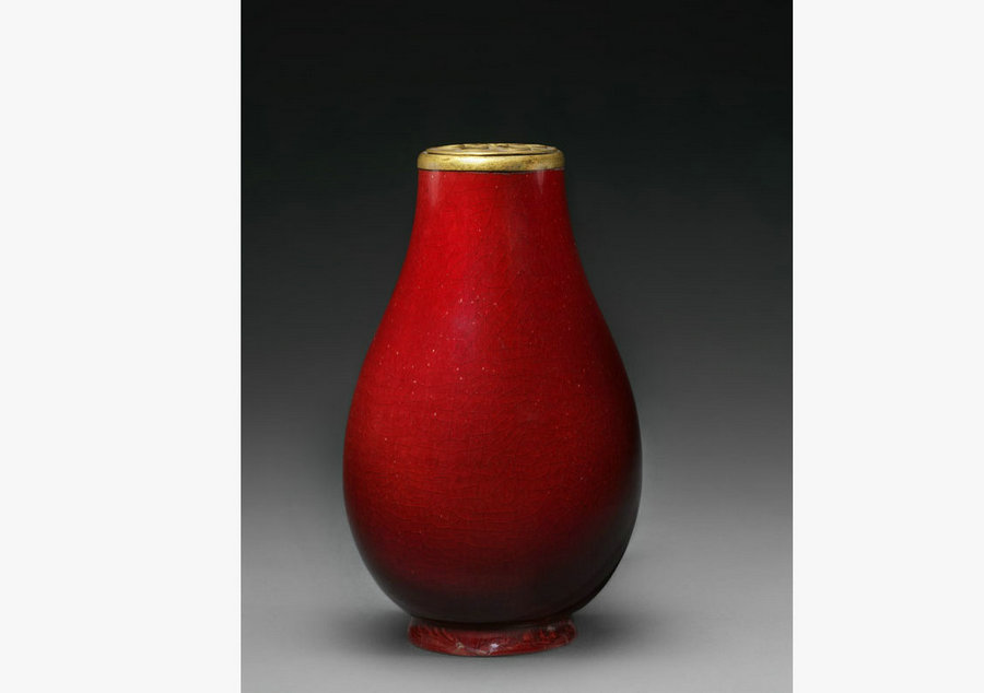 Ce vase à fleurs à gla?ure rouge du four de Lang est montré au public pour la première fois. [Photo / Musée de la Capitale]