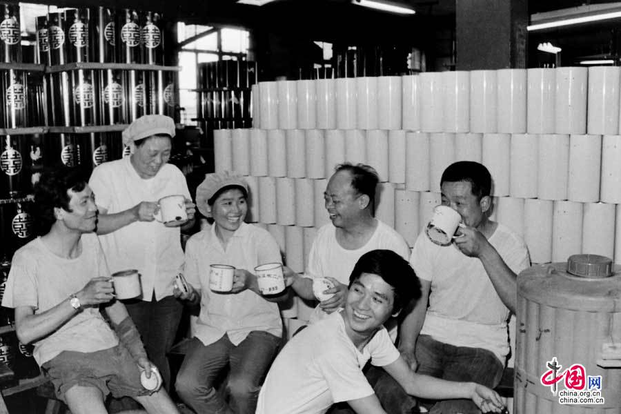 Le 11 juillet 1983, des ouvriers boivent du jus de prune pour se rafra?chir dans une usine de Shanghai.