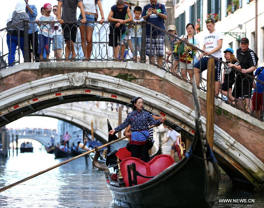 Wu Juan (devant), une batelière de Zhouzhuang, chante des airs chinois et canote le long d'un canal avec un gondolier à Venise, en Italie, le 21 juillet 2015.