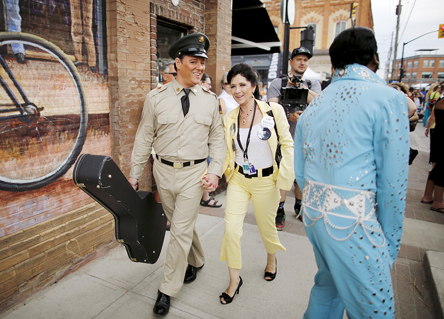 Bruce Stewart (gauche) native de la baie Georgienne et Lorenz Francke de Scarborough, rendent hommage à Elvis Presley, dans le cadre des quatre journées du Festival Elvis de Collingwood (Ontario), le 25 juillet2015. [Photo/Agences]