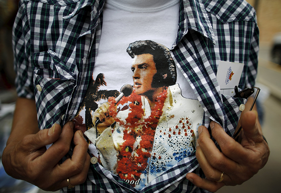 Un fan d'Elvis Presley fier d'exhiber son T-shirt à l'occasion des quatre jours du grand Festival Elvis de Collingwood (Ontario), le 25 juillet 2015. [Photo/Agences]