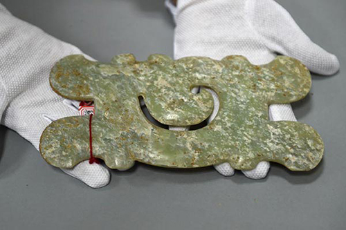 Un dragon de jade enroulé, récupéré après le pillage d'une tombe plus t?t cette année dans la province du Liaoning. [Photo / Xinhua]