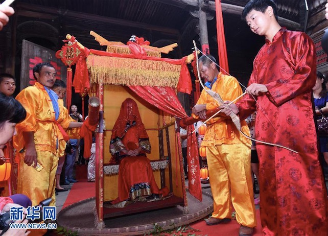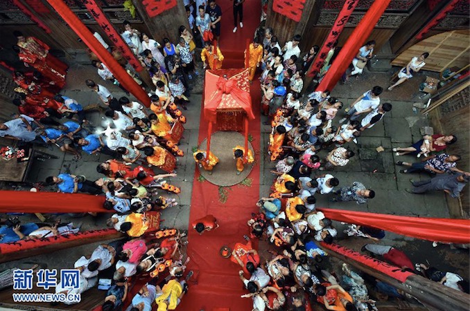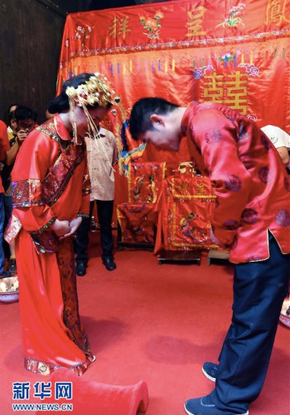 A Wuyuan dans la province du Jiangxi, sept couples vêtus de tenues traditionnelles se sont dit oui lors d'une cérémonie de mariage de groupe qui s'est tenue hier à l'occasion de la fête Qixi, la Saint-Valentin chinoise.
