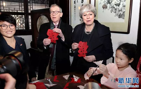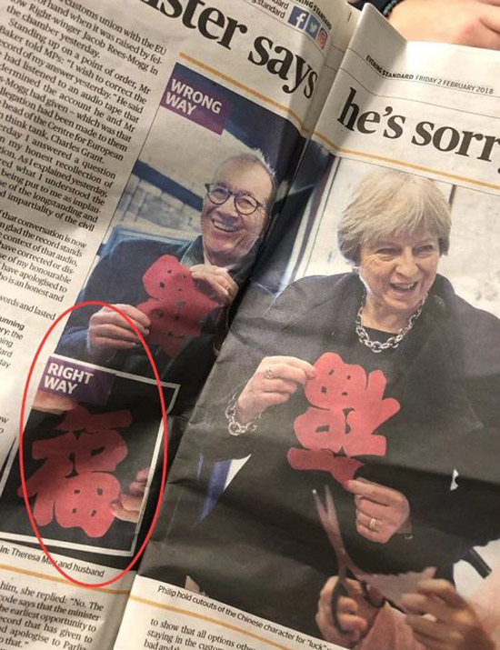 Lors de sa récente visite d’état en Chine Mme May et son mari se sont rendus au Jardin Yu de Shanghai pour y faire l'expérience de la technique du papier découpé. Selon certains témoignages, le couple aurait ? embarrassé ? toutes les personnes présentes en ? montrant par erreur ? le papier découpé du caractère ? Fu ? à l'envers.