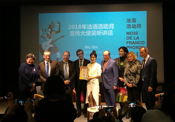 Cette année la marraine de la francophonie est Wu Xin. Présentatrice célèbre de l'émission Happy Camp de Hunan TV, peu de gens savent qu'elle détient une licence de langue fran- ?aise de l'Université des langues étrangères de Dalian. Elle défend l'idée que ? la langue fran?aise nous ouvre au monde car c'est une langue à la fois riche de son passé mais aussi tournée vers le futur. […] Parler fran?ais, c'est aussi accéder aux cultures et aux peuples des pays d'Afrique, d'Amérique, d'Asie, d'Europe et aussi d'Océanie. ?