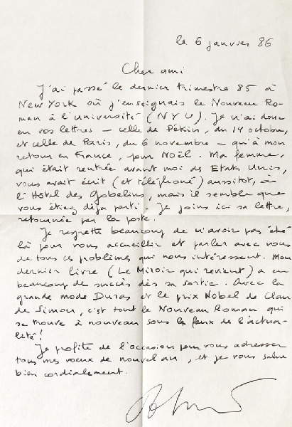 Lettre d'Alain Robbe-Grillet à Zheng Yonghui datée du 6 janvier 1986