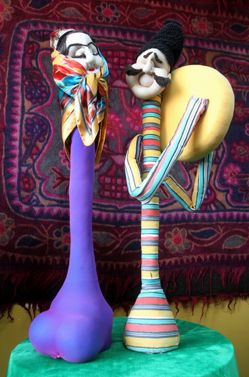 Deux poupées ? Xiusu ? en tissu fabriquées à la main par Shan Xiumei, exposées dans sa boutique d'Urumqi, capitale de la région autonome ou?ghoure du Xinjiang. (Jin Wei / pour le China Daily)