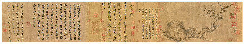 Cette peinture fait partie d'un rouleau qui comprend également quatre commentaires manuscrits en calligraphie traditionnelle, qui portent sa longueur à 186 cm. L'un d'eux est de la main de Mi Fu qui, avec Su Shi, figure parmi les ? quatre grands calligraphes de la dynastie Song ?.