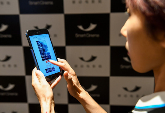 Un membre du personnel montre le processus d'achat d'un film sur un téléphone mobile avec l'application ? Cinéma mobile ?, le 9 mai 2018. Le même jour, la session annexe ? Mont Dingjun ? du 14e Salon international de l'industrie culturelle de Chine (Shenzhen) a lancé le produit ? Cinéma mobile ?, qui utilise une technologie de projection 2K (2048*1080) et permet de visualiser des films via des terminaux mobiles et d'autres équipements pendant la période de diffusion, et qui seront également inclus dans les statistiques du box-office du cinéma chinois. (Photo Xinhua)
