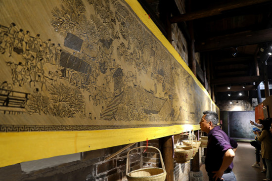Un visiteur admire l'?uvre de Xu Jianyuan "la scène au bord du fleuve au festival de Qingming (Photo fournie par Xu Jianyuan)