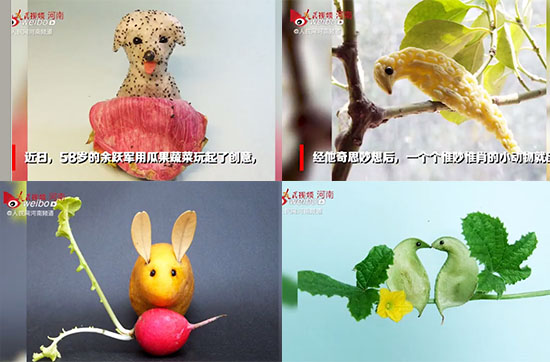 Un escargot na?f, un petit lapin mignon, un perroquet intelligent ... à Kaifeng dans la province du Henan (centre de la Chine), Yu Yuejun, 58 ans, utilise le concombre amer, l'aubergine, le chou, le poivron, le radis et d'autres légumes pour faire une variété de petits animaux vifs.
