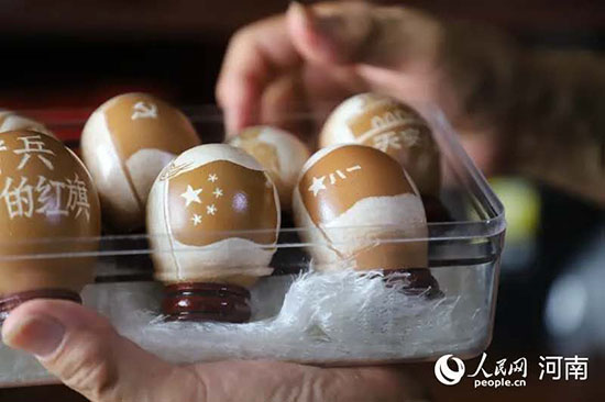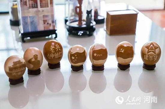 Le 1er ao?t, journée de l'armée, il a créé une série de sculptures sur ?ufs. La place Tian'anmen, le drapeau national, le drapeau du parti, le drapeau militaire et des salutations militaires ont respectivement gravés sur sept coquilles d'?ufs de taille similaire.