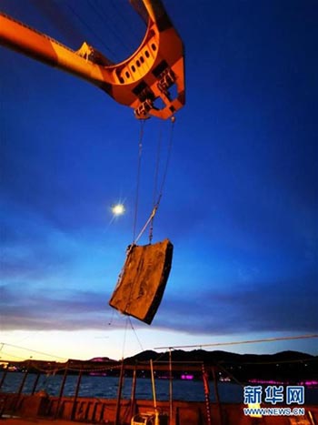 Une plaque en fer du Dingyuan, vaisseau amiral de la Flotte de Beiyang coulé pendant la guerre sino-japonaise de 1894-95, a été récupérée de l'eau près de l'?le de Liugong.