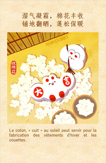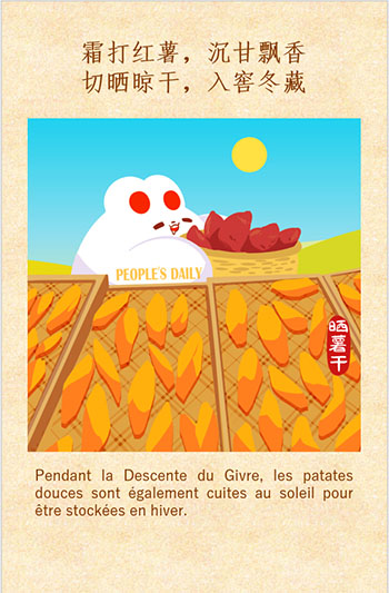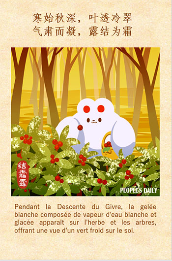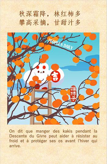 Ce 23 octobre marque la Descente du Givre ou Shuang Jiang, le dernier terme solaire de l'automne dans le calendrier lunaire chinois traditionnel. Pendant cette période, la température tombe et le gel commence à appara?tre. Ce jour-là, les gens mangent des kakis et font sécher au soleil les tissus de coton et des patates douces.