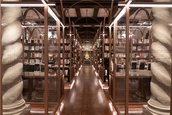 En se promenant dans la librairie, ils peuvent admirer les détails des batiments historiques protégés par des couvertures en verre et des sculptures d'artistes japonais.