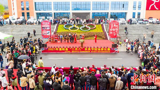 La scène du Concours de battage du camellia lors du Festival des outils agricoles du ? 8 février ? à Guanyang, dans la région autonome Zhuang du Guangxi (sud-ouest de la Chine).