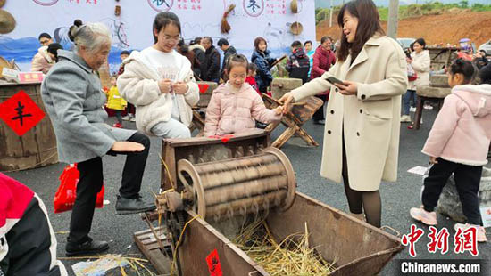 Des touristes utilisent des outils agricoles lors du Festival des outils agricoles du ? 8 février ? à Guanyang, dans la région autonome Zhuang du Guangxi (sud-ouest de la Chine).