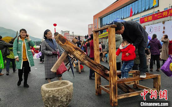 Des touristes jouent avec un pilon pour décortiquer le riz lors du Festival des outils agricoles du ? 8 février ? à Guanyang, dans la région autonome Zhuang du Guangxi (sud-ouest de la Chine).