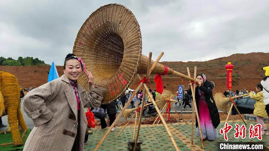 Une danseuse souffle dans un ? Jiaojiao ?, un instrument musical traditionnel de Guilin, lors du Festival des outils agricoles du ? 8 février ? à Guanyang, dans la région autonome Zhuang du Guangxi (sud-ouest de la Chine).