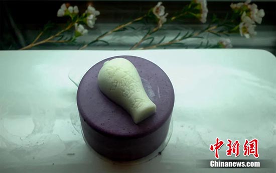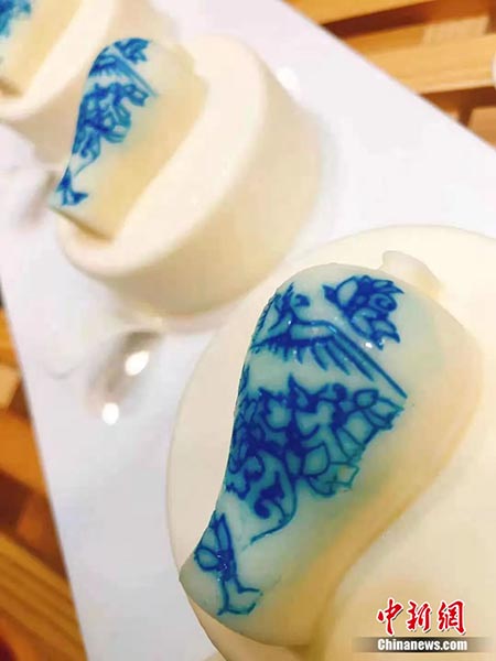 Regardant cette ? Bouteille aux prunes bleues de la dynastie Yuan ?, des patissiers professionnels ont procédé à des modifications à la main pour présenter l'effet de la porcelaine bleu et blanc de la dynastie Yuan.