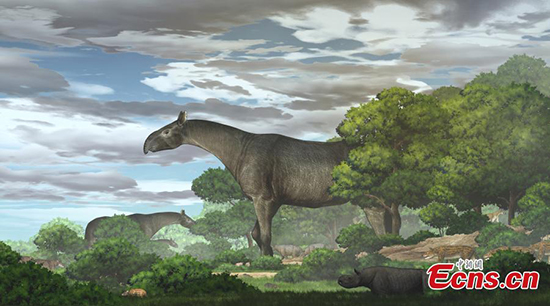 Une reconstruction écologique du Paraceratherium linxiaense à la fin de l'Oligocène. (Photo / l'Institut de paléontologie et de paléoanthropologie des vertébrés, Académie chinoise des Sciences)