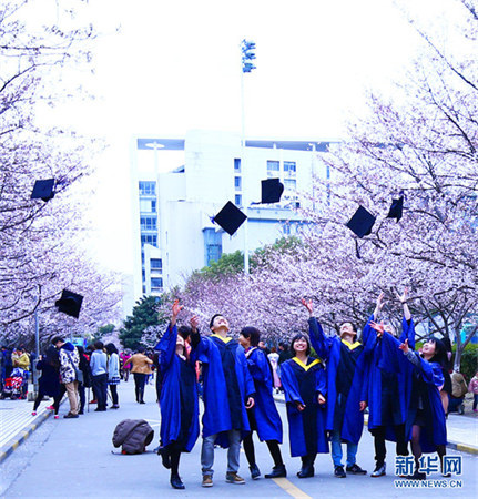 Des allées de cerisiers en fleurs attirent des dipl?més à l'Université Tongji. (Photo / Xinhua)
