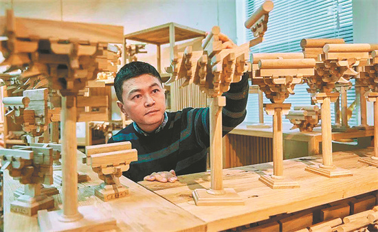 Liu Wenhui travaille avec des blocs à mortaise et à tenon dans son bureau de Hangzhou, capitale de la province du Zhejiang (est de la Chine). (Photo / China Daily)