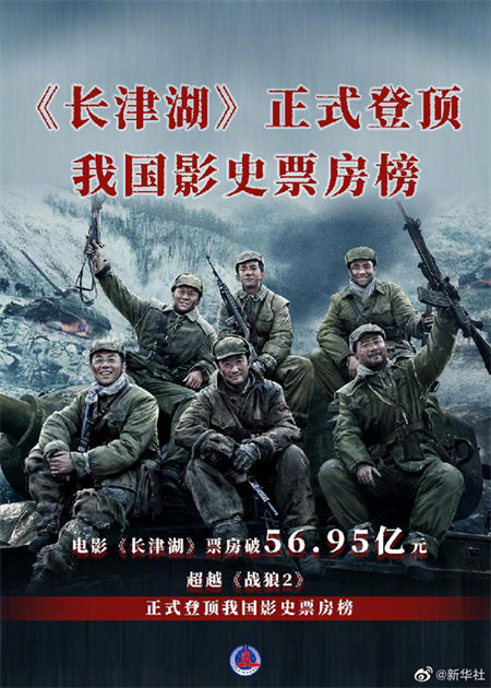 Selon les données du Bureau national de la commission des films, à la date du 25 novembre 8 heures du matin, le box-office du film ? Lac Changjin ? a atteint 5,695 milliards de yuans, dépassant ? Wolf Warrior 2 ? (5,6945 milliards de yuans), devenant le film le plus rentable du marché cinématographique chinois. Dans le même temps, sur le marché mondial, le ? Lac Changjin ? est également classé en tête du box-office pour l'année 2021.