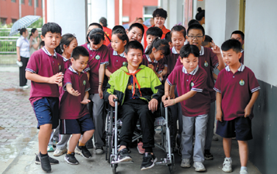 Avec l'aide de bénévoles, un élève de 15 ans atteint de paralysie cérébrale entre dans un campus à Taiyuan, capitale de la province du Shanxi (nord de la Chine), en juin 2020, et suit des cours avec d'autres enfants. (Photo / China News Service)