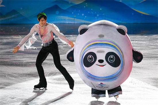 Le patineur japonais Hanyu Yuzuru et Bing Dwen Dwen se produisent lors du gala de patinage artistique des Jeux olympiques d'hiver de Beijing 2022 au stade couvert de la capitale, le 20 février 2022 à Beijing. (Wang Fei / Xinhua)