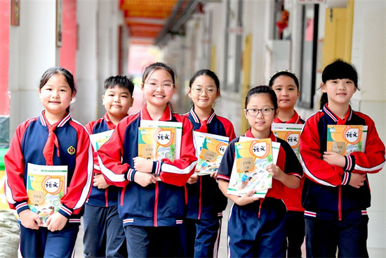 Des élèves montrent leurs nouveaux manuels dans une école primaire à Bozhou, dans la province orientale de l'Anhui, le 1er septembre 2021. (Xinhua/Liu Qinli)
