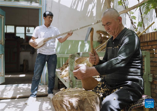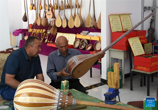 Des artisans discutent de la fabrication d'un instrument dans un atelier d'instruments de musique traditionnels dans le village de Towanki-ogusak dans la préfecture de Kashgar, dans la région autonome ou?ghoure du Xinjiang au nord-ouest de la Chine, le 28 mai 2022. (Xinhua/Du Gang)