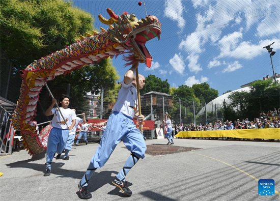 Des amateurs d'arts martiaux donnent un spectacle de danses traditionnelles chinoises de l'épée et du dragon lors du Festival culturel de Shaolin à Vienne, capitale de l'Autriche, le 11 juin 2022.