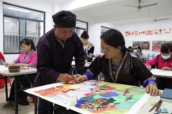 En mai 2022, dans un centre culturel du comté autonome miao de Rongshui de la ville de Liuzhou de la région autonome Zhuang du Guangxi (dans le sud de la Chine), Miao Jialin, expert en tableaux réalisés par des paysans, leur enseigne la peinture. (Liao Ziyuan / Pic.people.com.cn)